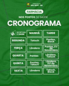 Home** Notícias **Prefeitura InformaSecretaria de saúde divulga cronograma semanal da farmácia nos postos Prefeitura InformaSecretaria de Saúde Secretaria de saúde divulga cronograma semanal da farmácia nos postos 13.04.2026 6 Sugestão de leitura Esporte movimenta o fim de semana em São Sepé com rodada do futebol de campo e festival de capoeira Destaques Campanha Imposto do Bem incentiva destinação do IR para fundos municipais Destaques Sábado de alegria e artesanato na praça Destaques São Sepé é contemplado com pá carregadeira por meio de emenda Destaques Sinalização reforça segurança nas escolas Destaques